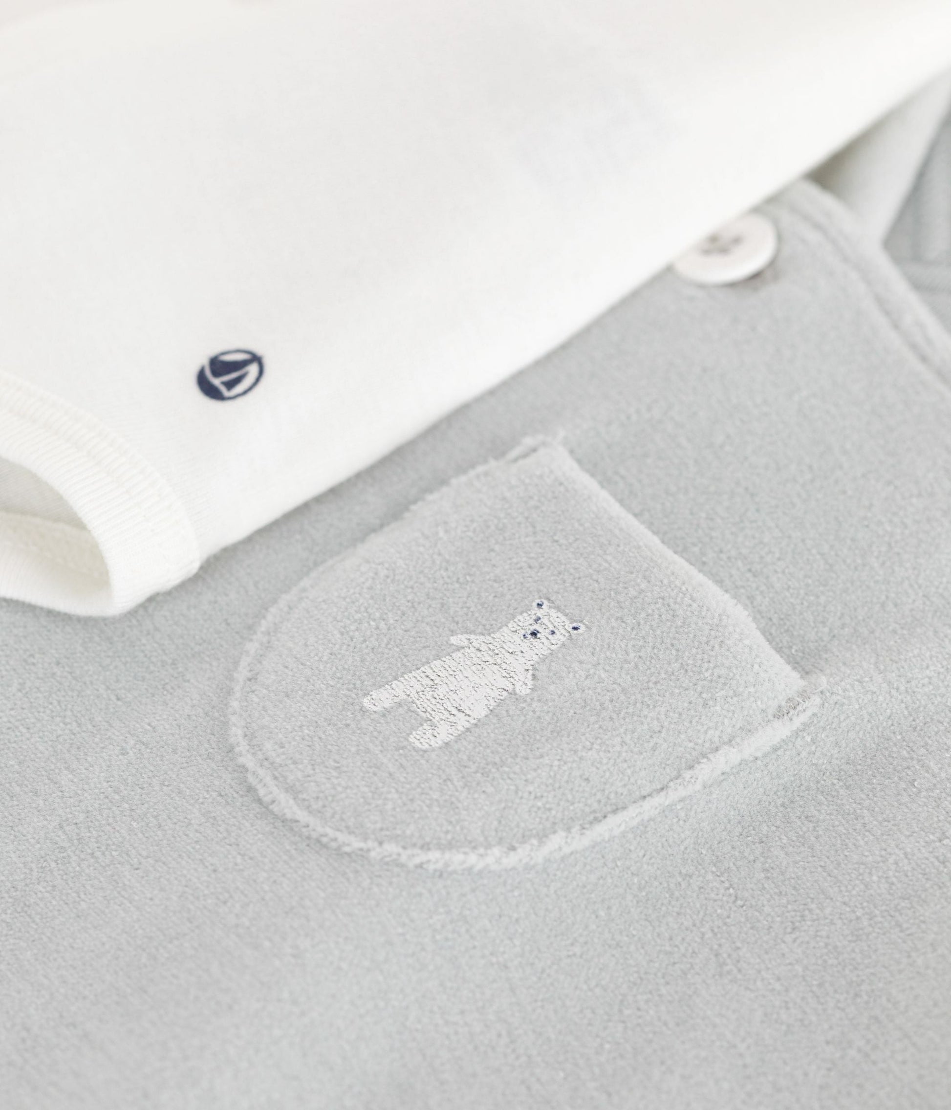 Salopette garçon en bouclette velours, une matière douce pour l'hiver et son body en côte 1X1.